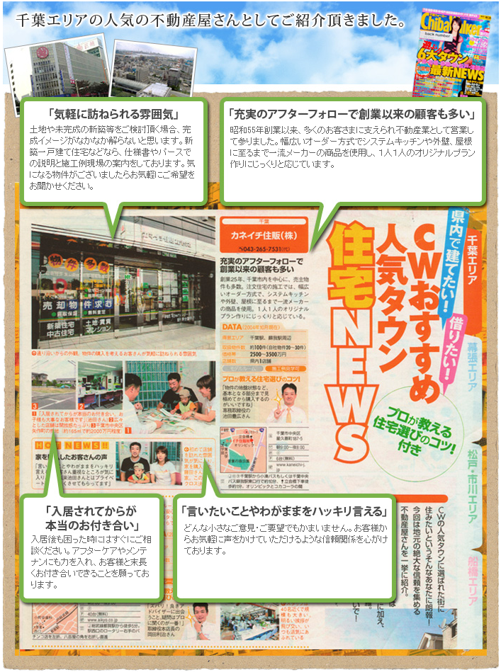 千葉市中央区、若葉区、緑区、稲毛区周辺で売り地や一戸建てをお探しならカネイチ住販株式会社にお任せ下さい。地域に根ざした情報網で、掘り出し物の物件情報が手に入るかもしれません。住宅用の土地だけでなく商業用の売り地や、新築・中古住宅のラインナップも豊富! また、このホームページでは物件情報のみならず、地域の情報も合わせて掲載しています。今、各方面で話題のハウスガードシステムも、千葉エリアでの取り扱いはここだけ! 安心と信頼のカネイチ住販をどうぞ宜しくお願い致します。