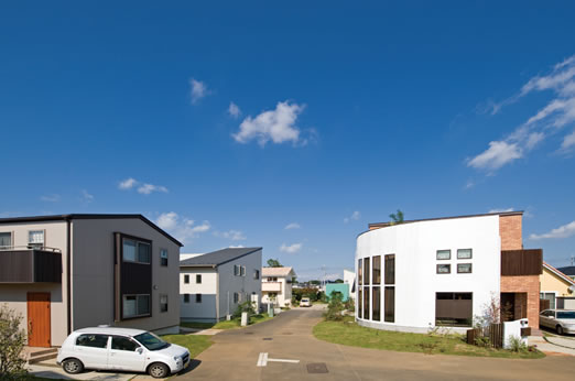 角地の敷地でアールという土地の形がプランニングのコンセプトになったお洒落で上質感のある感成住宅が龍ヶ崎に完成しました。敷地形状を最大限に生かし円を描くようにプランニングされた美しい一邸です。アールの美しいフォルムを風景に参加させることにより、より風景を美しくしたいという発想から生まれた空間です。ランドマークのようなイメージでそこを通る人にも愉しんでもらえる景色を想像しながら創り上げた外観デザインです。