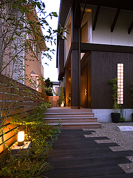 感成住宅 作品事例② おもてなしの極意「京町屋の風情」外からの喧噪を遮断し、プライバシーに配慮した外観と変形敷地の条件を生かして、空へと広がる視線をデザインしました。開放感のあるアプローチは直線ですっきりとしたステップで、外観と調和して訪れる人を優しく迎えてくれます。視線は閉じながら温もりのある色調が家全体のイメージを優しい雰囲気にしています。