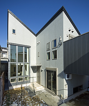 感成住宅 作品事例⑤ 外を内の空間に取り込んだ家密接した都会の敷地条件をクリアし、開放感のある快適な空間をどのように造ればいいのか?その答えのひとつがコートハウスです。外観はシャープな雰囲気をイメージし、コンクリートの打ちっ放しのようなテクスチャーをサイディングで造りあげています。北側斜線の高さ制限が厳しいため、あえてフロアを地面と同じ位置にすることで、吹き抜けの上下の高さを確保し開放感をより鮮明にしています。ライトコートか らの光と風と視界の抜けを窓でデザイン。白いタイルを敷き詰めて高級感を醸しだし、冬の寒さの欠点を補うために床暖房を装備。限られた敷地条件から吹き抜けの明るく広いLDKの空間が生まれました。