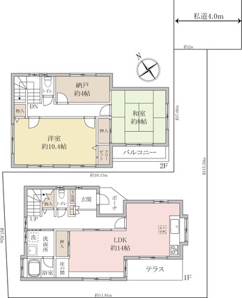 | 駐車場 | 駐車場:有り/空有 | 接道状況 | 一方 北東側 間口2.0m 私道 幅4.0m |