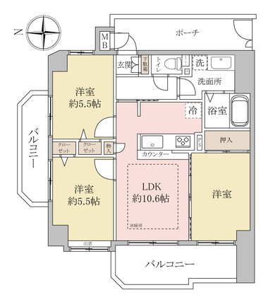 | 専有面積 | 60.7m2(壁芯) | バルコニー面積 | 13.8m2 |