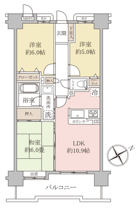 | 専有面積 | 61.36m2(壁芯) | バルコニー面積 | 9.57m2 |