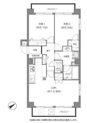 | 専有面積 | 56m2(壁芯) | バルコニー面積 | 11.9m2 |