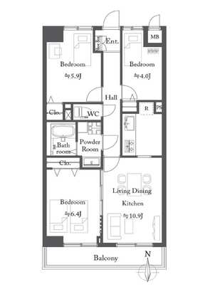 | 専有面積 | 62.72m2(壁芯) | バルコニー面積 | 6.72m2 |