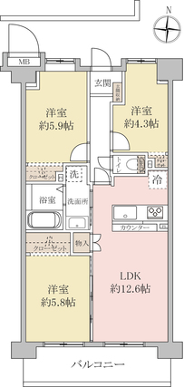 | 専有面積 | 63.63m2(壁芯) | バルコニー面積 | 9.28m2 |