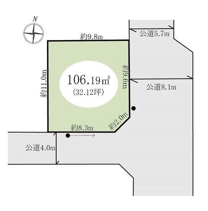 | 接道状況 | 角地 南側 間口8.3m 公道 幅4.0m 北西側 間口1m |