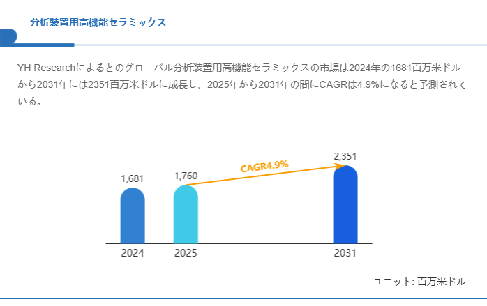 YH Researchによるとのグローバル分析装置用高機能セラミックスの市場は2024年の1681百万米ドルから2031年には2351百万米ドルに成長し、2025年から2031年の間にCAGRは4.9%になると予測されている。