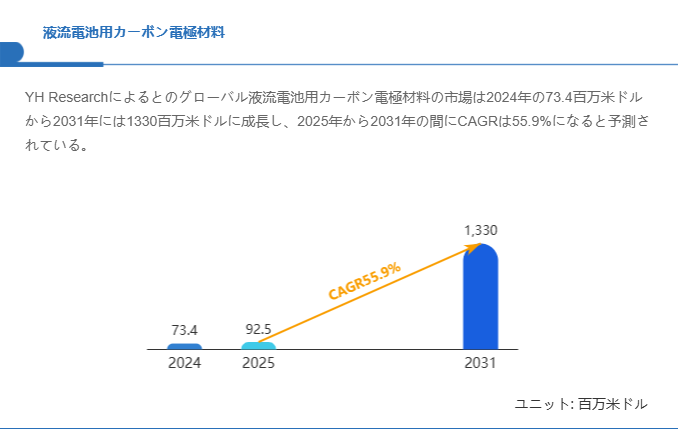 YH Researchによるとのグローバル液流電池用カーボン電極材料の市場は2024年の73.4百万米ドルから2031年には1330百万米ドルに成長し、2025年から2031年の間にCAGRは55.9%になると予測されている。