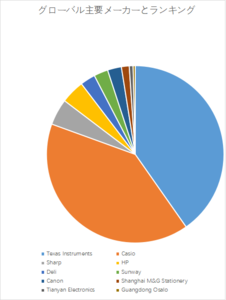 この背景には、教育需要の継続と産業現場での使用習慣がある。市場シェア構成を見ると、Texas InstrumentsとCasioの2社で大きな割合を占めており、SharpやHP、Canonなどが続く。特に日本市場ではCasioとSharpのプレゼンスが高く、教育制度と結びついた需要が安定を支えている。他方、中国メーカーや新興プレイヤーもシェアを拡大しつつあり、低価格帯を中心に競争の多様化が進んでいる。こうした国際競争のなかで、日本市場はブランド価値と制度的背景により安定したポジションを維持している。