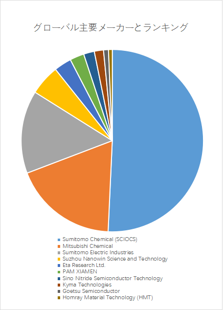 企業別の市場シェアを見ると、住友化学(SCIOCS)が80.77百万ドルの規模で圧倒的な存在感を示し、リーディングカンパニーとして市場を牽引している。三菱化学が29.42、住友電気工業が23.40と続き、日本企業がグローバル市場の主導権を確保していることが特徴である。一方、中国勢も台頭しており、蘇州納維科技(8.57)、中氮半導体技術(3.03)、宏瑞材料科技(1.07)などが存在感を高めつつある。さらに米国のEta Research(4.94)、Kyma Technologies(2.59)、越芯半導体(1.39)など、各国の新興プレイヤーも参入している。市場は寡占構造に近いが、技術的差異化と供給能力の拡充により、今後は「日米先進企業対中国新興勢」の構図が鮮明化する可能性が高い。供給不足リスクや高価格帯の課題を背景に、各社は結晶成長技術、量産化プロセス、コスト低減戦略を競い合い、グローバル市場での競争優位を模索している。