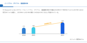 2024年、世界のIGZO市場規模は約171百万ドルであり、2031年には322百万ドルに達すると予測されている。年平均成長率は9.5%に上り、先端ディスプレイ市場の拡大が主因である。需要側では、スマートデバイスや高解像度テレビの普及が成長をけん引し、自動車ディスプレイや医療用モニターなど新しい応用分野も市場を押し上げている。一方で供給側においては、原料の戦略的重要性が浮き彫りとなっている。中国政府は2023年よりガリウム関連製品を輸出規制対象とし、2025年にはインジウムにも輸出管制を導入した。これにより原料調達コストの上昇や成品輸出制約が生じ、グローバルな供給バランスに変化が見られる。供給制約は短期的には価格を押し上げる要因となるが、中長期的には国際的な交渉や代替技術開発が市場の安定化を促すとみられる。