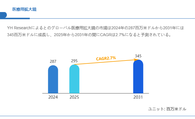 YH Researchによるとのグローバル医療用拡大鏡の市場は2024年の287百万米ドルから2031年には345百万米ドルに成長し、2025年から2031年の間にCAGRは2.7%になると予測されている。