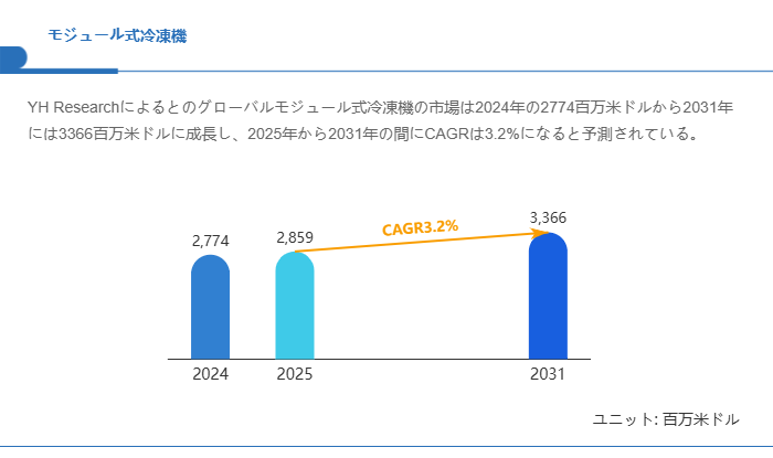 YH Researchの最新調査によると、世界のモジュール式冷凍機市場は、2024年の2774百万米ドルから2025年には2859百万米ドルへと拡大し、2031年には3366百万米ドルに達すると予測されています。この間、CAGR(年平均成長率)は3.2%と推計されています。