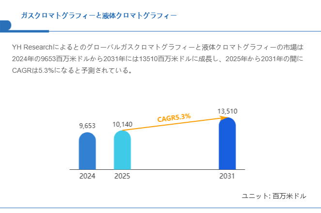 YH Researchによるとのグローバルガスクロマトグラフィーと液体クロマトグラフィーの市場は2024年の9653百万米ドルから2031年には13510百万米ドルに成長し、2025年から2031年の間にCAGRは5.3%になると予測されている。