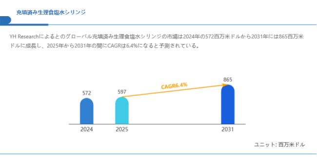 充填済み生理食塩水シリンジの主な用途は、輸液や薬剤投与の準備、あるいは検査用の液体供給に利用される。近年では、患者の入院治療や緊急対応における注射器の使用頻度が増加しており、これにより市場規模は急速に拡大している。特に、医療機器の衛生基準の厳格化や病院の感染対策強化が進む中、充填済みシリンジの需要は高まりつつある。YH Research調査チームの最新レポート「グローバル充填済み生理食塩水シリンジのトップ会社の市場シェアおよびランキング 2025」によると、2025年から2031年の予測期間中のCAGRが6.4%で、2031年までにグローバル充填済み生理食塩水シリンジ市場規模は865百万米ドルに達すると予測されている。