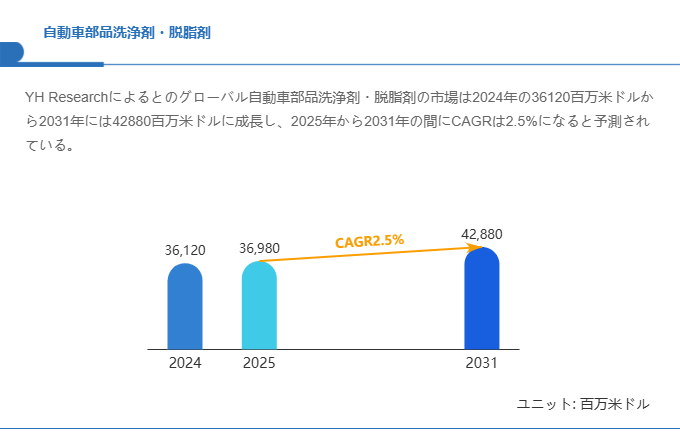 YH Researchの最新調査によると、世界の自動車部品洗浄剤・脱脂剤市場は、2024年の36120百万米ドルから2025年には36980百万米ドルへと拡大し、2031年には42880百万米ドルに達すると予測されています。この間、CAGR(年平均成長率)は2.5%と推計されています。