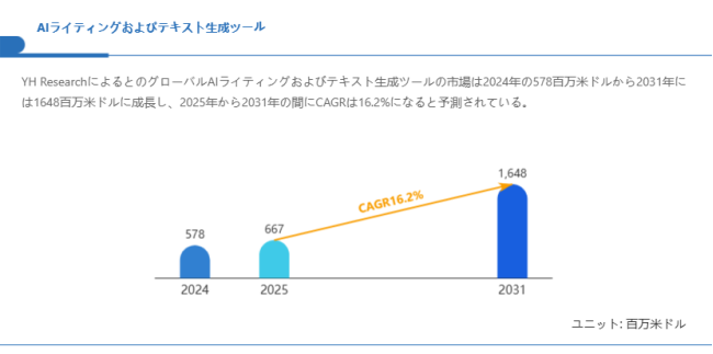 YH Researchの最新報告「グローバルAIライティングおよびテキスト生成ツールのトップ会社の市場シェアおよびランキング 2026」によれば、2025年から2031年の予測期間において、グローバルAIライティングおよびテキスト生成ツール市場は年平均成長率(CAGR)16.2%という驚異的なペースで拡大し、2031年には1648百万米ドルに達すると見込まれている。これは、生成AI技術が単なるトレンドではなく、産業基盤として確立しつつあることを示す数字である。