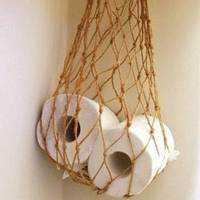 簡単に作れる麻ひもバッグで吊り下げ収納。気取らない見た目が良い。