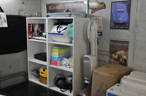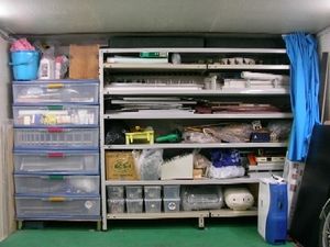 棚の段数を増やすため、90cmの棚板4枚を流用し、2段追加しています。これで、大型ユニットを収納。長めの部品や道具を上手く収納されています。