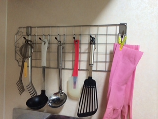 キッチンの壁に金属の網のようなものを貼り付けて収納を作ってしまいます。