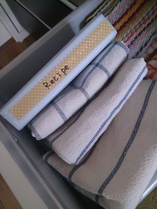 小さくファイリングできたので、置場所を食器棚の引き出しの中に変えて、料理の作業中にすぐに見られるようにしました。