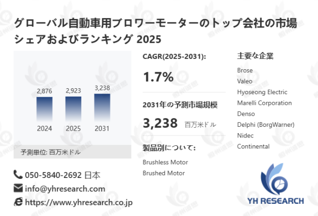 YH Research調査チームの最新レポート「グローバル自動車用ブロワーモーターのトップ会社の市場シェアおよびランキング 2026」によると、2025年から2031年の予測期間中のCAGRが1.7%で、2031年までにグローバル自動車用ブロワーモーター市場規模は3238百万米ドルに達すると予測されています。