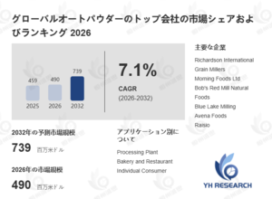 無料サンプル公開中!下記リンクからレポート内容を確認し、直接お申し込み可能です。https://www.yhresearch.co.jp/reports/1252230/oat-flour--oat-powder YH Research株式会社は、最新調査レポート「グローバルオートパウダーのトップ会社の市場シェアおよびランキング 2026」を発行しました。2021-2032年のデータに基づき、オートパウダー市場の最新動向、市場規模、成長予測を詳細に分析しています。売上高、販売量、平均価格、年平均成長率(CAGR)などの主要指標を用いて市場の全体像をわかりやすく示しています。主要企業の市場シェアと順位、競争環境の変化、新技術の普及状況、製品開発のトレンドも分析し、企業が中長期の戦略を構築するために必要な実用的なインサイトを提供します。市場セグメンテーションと詳細分析オートパウダーの世界市場は、製品タイプ、用途分野、主要企業、地域の4つの視点から分類され、各セグメントの成長性や競争環境を多角的に分析しています。市場動向を把握し、事業戦略の立案に活用できるデータを提供します。1. 製品タイプ別分析:Conventional、 Organic各製品カテゴリーにおけるオートパウダー市場規模、売上、販売量、平均価格、CAGR(年平均成長率)を詳細に分析します。競争力の高い製品や成長が期待される領域を特定し、技術革新の影響や注目分野を明示します。2. 用途別分析:Processing Plant、 Bakery and Restaurant、 Individual Consumer産業用途や最終使用シーンごとに、オートパウダーの市場規模、導入状況、需要動向、成長要因を評価します。用途別セグメントにおける潜在的な市場機会や課題を整理し、戦略策定の指針を示します。3. 主要企業別分析:Richardson International、 Grain Millers、 Morning Foods Ltd、 Bob's Red Mill Natural Foods、 Blue Lake Milling、 Avena Foods、 Raisio、 Swedish Oat Fiber、 Quaker Oats Company、 Arrowhead Mills、 Helsinki Mills Ltd、 Betterbody Foods、 Dobeles Dzirnavnieks、 King Arthur Flour、 YanGuFang Internatio、 Guilin Seamild Foodsオートパウダー市場でリーダーシップを持つ企業の売上、シェア、成長戦略、競争優位性を比較分析します。各企業の市場におけるポジショニングや競争構造を明確化し、企業戦略の策定に役立つ情報を提供します。4. 地域別分析:北米、欧州、アジア太平洋、南米、中東・アフリカ各地域におけるオートパウダー市場の規模、成長ドライバー、規制環境、経済状況を総合的に評価します。地域特性に基づく市場機会や成長ポテンシャルを明示し、地域戦略策定に活用可能な情報を提供します。本レポートの活用価値本レポートは、グローバルオートパウダー市場の現状と将来予測を多角的に分析し、企業の戦略立案や投資判断に直接関連する洞察を提供いたします。以下の観点から、市場理解と意思決定に役立つ情報を整理しています。1.市場規模と成長性の可視化過去データ(2021-2025年)と将来予測(2026~2032年)に基づき、オートパウダー市場の規模、成長率、構造変化を定量的に評価します。中長期的な事業戦略策定や投資判断の基盤となるデータを提供します。2.世界トップ10企業の競争戦略分析オートパウダー市場の有力企業の売上高、価格設定、市場シェア、企業ランキングを分析します。競争優位性や差別化戦略、各社のポジショニングを明確化し、戦略立案に活用可能です。(2021-2026年)3.日本市場の詳細分析日本オートパウダー市場における成長要因、競争環境、主要企業の動向を評価します。現地市場への参入や拡大計画の立案に役立つ洞察を提供します。(2021-2026年)4.消費地域の構造と動向把握北米、欧州、アジア太平洋など主要消費地域におけるオートパウダーの需要構造、消費傾向、流通チャネルを分析し、地域別マーケティング戦略やターゲット市場選定の最適化に貢献します。5.供給能力・生産構造の把握オートパウダーの主要生産地域ごとの生産能力、出荷量、供給体制を分析し、世界的な需給バランスや供給リスクの兆候を評価し、グローバルサプライチェーン戦略の策定に役立ちます。6.サプライチェーン全体の分析原材料調達から製造・流通・販売に至るオートパウダーのサプライチェーン全体を詳細に検討します。コスト構造、潜在課題、外部リスクを明示し、企業の対応力・柔軟性を高める改善策と戦略的提言を提供します。【レポート目次】第1章:市場概況と定義オートパウダー市場の定義、規模、成長予測(2026~2032)を提示します。世界および日本市場の売上、販売量、平均価格動向、主要市場課題や成長機会を包括的に分析します。第2章:主要企業の競争分析(2021-2026)オートパウダー市場におけるトップ企業の市場シェア、売上、ランキング、競争戦略を評価し、企業ポジショニングや差別化戦略を明確化します。第3章:日本市場動向と競合構造(2021-2026)日本オートパウダー市場の成長ドライバー、規制影響、主要企業の売上・シェア・ランキングを分析し、現地市場参入や拡大の戦略立案を提供します。第4章:生産・供給体制と成長可能性(2021-2032)主要生産地域におけるオートパウダ