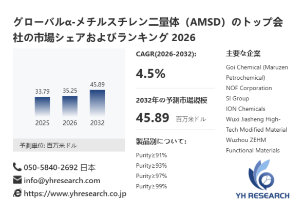 本記事は、YH Researchが発行したレポート「グローバルα-メチルスチレン二量体(AMSD)のトップ会社の市場シェアおよびランキング 2026」 を紹介しています。