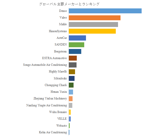 カーエアコン市場は、技術とサプライチェーンを掌握するグローバル大手によって寡占化が進んでいる。YH Researchによると、2024年時点でDenso、Valeo、Mahle、Hanon Systems、AoteCar、SANDEN、ESTRA Automotive、Bergstrom、Songz Automobile Air Conditioning、Highly Marelliなど上位10社が、世界市場の約63.0%を占めている。中でもDensoとValeoは電動化対応の熱マネジメントソリューションで先行し、Hanon Systemsは韓国勢としてグローバルOEMとの協業を強化している。中国企業のAoteCarやSongzは、低コスト・高効率のEV用エアコン開発で台頭しており、ローカル市場から世界市場への進出を図る段階にある。競争軸はもはや「冷却能力」ではなく、「エネルギー効率・統合制御・環境適合性」の三点に集約されつつある。