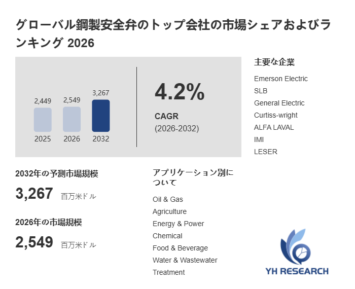 YH Researchの分析によれば、世界の鋼製安全弁市場は2025年に2449百万米ドルと推計され、2026年には2549百万米ドルへと成長する見通しです。さらに中期的には、2032年に3267百万米ドルへ到達すると予測されています。2026年から2032年にかけたCAGR(年平均成長率)は4.2%と見込まれ、市場成長は技術革新、用途拡大、産業全体の高度化に支えられています。