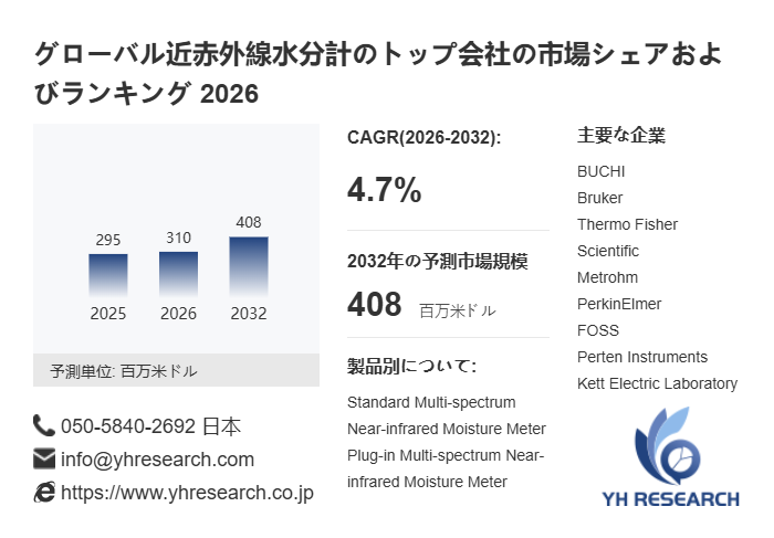 YH Researchの分析によれば、世界の近赤外線水分計市場は2025年に295百万米ドルと推計され、2026年には310百万米ドルへと成長する見通しです。さらに中期的には、2032年に408百万米ドルへ到達すると予測されています。2026年から2032年にかけたCAGR(年平均成長率)は4.7%と見込まれ、市場成長は技術革新、用途拡大、産業全体の高度化に支えられています。