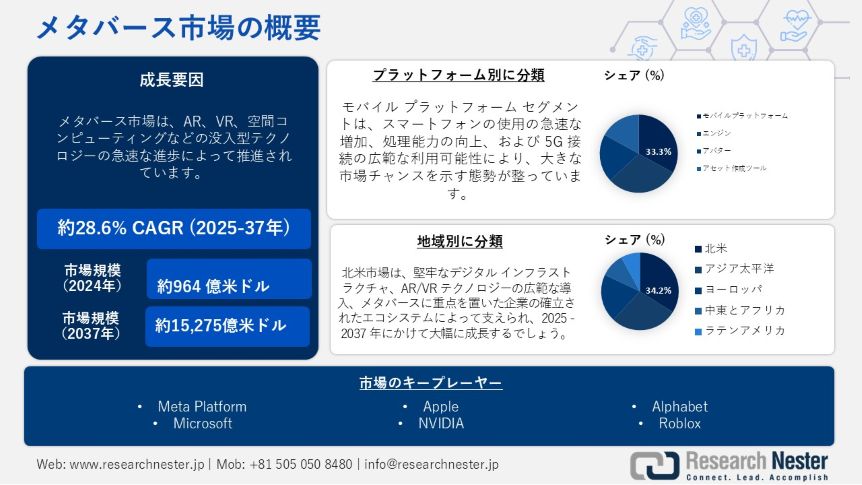 メタバース市場は、拡張現実(AR)、仮想現実(VR)、空間コンピューティング技術の革新、そして大手テクノロジー企業による巨額の投資によって急速に成長を遂げています。企業はメタバースプラットフォームを活用して、ユーザーエンゲージメント、デジタル商取引、リモートワークといった領域における業務プロセスを革新しようとしています。ブロックチェーン技術の導入により、資産やデジタルIDの分散管理が可能となり、ゲーム、教育、不動産といった業界におけるメタバースの普及が加速しています。