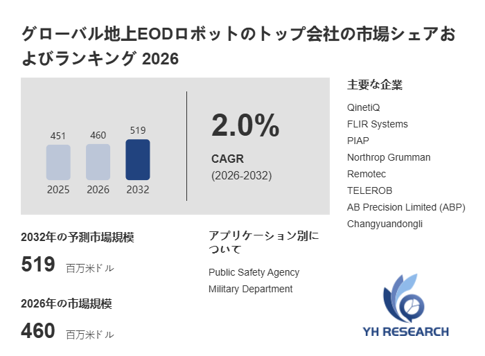 YH Researchの分析によれば、世界の地上EODロボット市場は2025年に451百万米ドルと推計され、2026年には460百万米ドルへと成長する見通しです。さらに中期的には、2032年に519百万米ドルへ到達すると予測されています。2026年から2032年にかけたCAGR(年平均成長率)は2.0%と見込まれ、市場成長は技術革新、用途拡大、産業全体の高度化に支えられています。