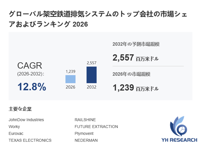 YH Researchによるとのグローバル架空鉄道排気システムの市場は2025年の1104百万米ドルから2032年には2557百万米ドルに成長し、2026年から2032年の間にCAGRは12.8%になると予測されている。