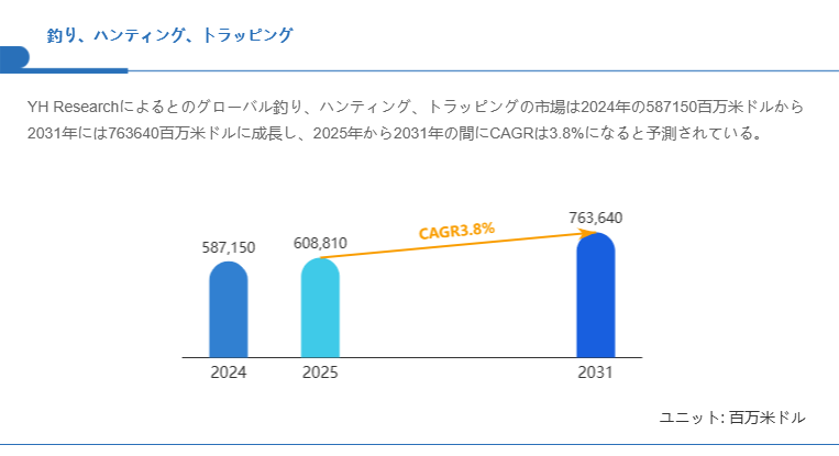 YH Researchによるとのグローバル釣り、ハンティング、トラッピングの市場は2024年の587150百万米ドルから2031年には763640百万米ドルに成長し、2025年から2031年の間にCAGRは3.8%になると予測されている。