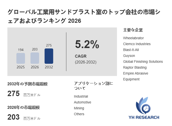 YH Researchの分析によれば、世界の工業用サンドブラスト室市場は2025年に194百万米ドルと推計され、2026年には203百万米ドルへと成長する見通しです。さらに中期的には、2032年に275百万米ドルへ到達すると予測されています。2026年から2032年にかけたCAGR(年平均成長率)は5.2%と見込まれ、市場成長は技術革新、用途拡大、産業全体の高度化に支えられています。