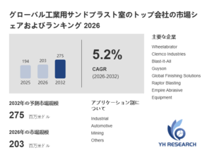 YH Researchの分析によれば、世界の工業用サンドブラスト室市場は2025年に194百万米ドルと推計され、2026年には203百万米ドルへと成長する見通しです。さらに中期的には、2032年に275百万米ドルへ到達すると予測されています。2026年から2032年にかけたCAGR(年平均成長率)は5.2%と見込まれ、市場成長は技術革新、用途拡大、産業全体の高度化に支えられています。無料サンプル公開中!下記リンクからレポート内容を確認し、直接お申し込み可能です。https://www.yhresearch.co.jp/reports/1391366/industrial-sandblasting-rooms YH Research株式会社は、最新調査レポート「グローバル工業用サンドブラスト室のトップ会社の市場シェアおよびランキング 2026」を発行しました。2021-2032年のデータに基づき、工業用サンドブラスト室市場の最新動向、市場規模、成長予測を詳細に分析しています。売上高、販売量、平均価格、年平均成長率(CAGR)などの主要指標を用いて市場の全体像をわかりやすく示しています。主要企業の市場シェアと順位、競争環境の変化、新技術の普及状況、製品開発のトレンドも分析し、企業が中長期の戦略を構築するために必要な実用的なインサイトを提供します。市場セグメンテーションと詳細分析工業用サンドブラスト室の世界市場は、製品タイプ、用途分野、主要企業、地域の4つの視点から分類され、各セグメントの成長性や競争環境を多角的に分析しています。市場動向を把握し、事業戦略の立案に活用できるデータを提供します。1. 製品タイプ別分析:Manual、 Automatic各製品カテゴリーにおける工業用サンドブラスト室市場規模、売上、販売量、平均価格、CAGR(年平均成長率)を詳細に分析します。競争力の高い製品や成長が期待される領域を特定し、技術革新の影響や注目分野を明示します。2. 用途別分析:Industrial、 Automotive、 Mining、 Others産業用途や最終使用シーンごとに、工業用サンドブラスト室の市場規模、導入状況、需要動向、成長要因を評価します。用途別セグメントにおける潜在的な市場機会や課題を整理し、戦略策定の指針を示します。3. 主要企業別分析:Wheelabrator、 Clemco Industries、 Blast-It-All、 Guyson、 Global Finishing Solutions、 Raptor Blasting、 Empire Abrasive Equipment、 Shanghai Liangshi Intelrobot Technology、 Qingdao Qinggong Machinery、 Qingdao Antai Heavy Industry Machinery、 JIANGSU LONGFA CAST & RUST REMOVING EQUIPMENT、 Dongguan Jichuan Machinery Technology、 Shandong Tianyi Equipment & Technology工業用サンドブラスト室市場でリーダーシップを持つ企業の売上、シェア、成長戦略、競争優位性を比較分析します。各企業の市場におけるポジショニングや競争構造を明確化し、企業戦略の策定に役立つ情報を提供します。4. 地域別分析:北米、欧州、アジア太平洋、南米、中東・アフリカ各地域における工業用サンドブラスト室市場の規模、成長ドライバー、規制環境、経済状況を総合的に評価します。地域特性に基づく市場機会や成長ポテンシャルを明示し、地域戦略策定に活用可能な情報を提供します。本レポートの活用価値本レポートは、グローバル工業用サンドブラスト室市場の現状と将来予測を多角的に分析し、企業の戦略立案や投資判断に直接関連する洞察を提供いたします。以下の観点から、市場理解と意思決定に役立つ情報を整理しています。1.市場規模と成長性の可視化過去データ(2021-2025年)と将来予測(2026~2032年)に基づき、工業用サンドブラスト室市場の規模、成長率、構造変化を定量的に評価します。中長期的な事業戦略策定や投資判断の基盤となるデータを提供します。2.世界トップ10企業の競争戦略分析工業用サンドブラスト室市場の有力企業の売上高、価格設定、市場シェア、企業ランキングを分析します。競争優位性や差別化戦略、各社のポジショニングを明確化し、戦略立案に活用可能です。(2021-2026年)3.日本市場の詳細分析日本工業用サンドブラスト室市場における成長要因、競争環境、主要企業の動向を評価します。現地市場への参入や拡大計画の立案に役立つ洞察を提供します。(2021-2026年)4.消費地域の構造と動向把握北米、欧州、アジア太平洋など主要消費地域における工業用サンドブラスト室の需要構造、消費傾向、流通チャネルを分析し、地域別マーケティング戦略やターゲット市場選定の最適化に貢献します。5.供給能力・生産構造の把握工業用サンドブラスト室の主要生産地域ごとの生産能力、出荷量、供給体制を分析し、世界的な需給バランスや供給リスクの兆候を評価し、グローバルサプライチェーン戦略の策定に役立ちます。6.サプライチェーン全体の分析原材料調達から製造・流通・販売に至る工業用サンドブラスト室のサプライチェーン全体を詳細に検討します。コスト構造、潜在課題、外部リスクを明示し、企業の対応力・柔軟性を高める改善策と戦略的提言を提供します。【レポート目次】第1章:市場概況と定義工業用サンドブラスト室市場の定義、規模、成長予測(2026~2032)を提示します。世界および日本市場の売上、販売量、平