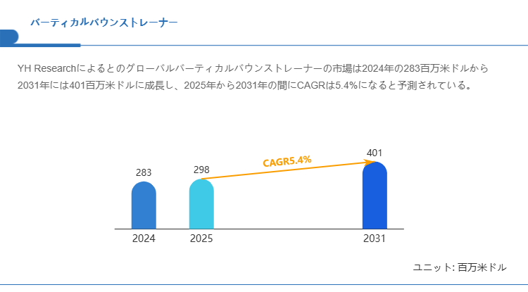 YH Researchの調査によると、グローバルバーティカルバウンストレーナー市場は2024年の283百万米ドルから2025年には298百万米ドルに成長し、 2031年には401百万米ドルに達すると予測されています。2025年から2031年のCAGR(年平均成長率)は5.4%%と見込まれ、市場の拡大は、技術革新、需要の増加、規制の強化などの要因によって推進されています。