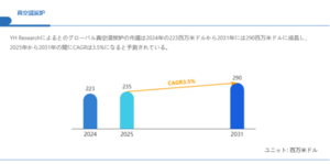 YH Research(YHリサーチ)は、グローバルビジネスをサポートする市場調査と情報提供の企業です。業界調査レポート、カスタムレポート、IPOアドバイザリーサービス、ビジネスプラン作成など、企業の成長と発展を支援するサービスを提供しています。 世界5カ国にオフィスを構え、100カ国以上の企業に正確で有益なデータを提供し、業界動向や競合分析、消費者行動分析などを通じて、企業が市場の変化に迅速に対応できるようサポートしています。