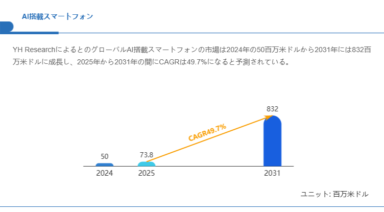YH ResearchによるとのグローバルAI搭載スマートフォンの市場は2024年の50百万米ドルから2031年には832百万米ドルに成長し、2025年から2031年の間にCAGRは49.7%になると予測されている。