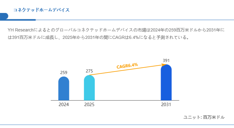 YH Researchによるとのグローバルコネクテッドホームデバイスの市場は2024年の259百万米ドルから2031年には391百万米ドルに成長し、2025年から2031年の間にCAGRは6.4%になると予測されている。