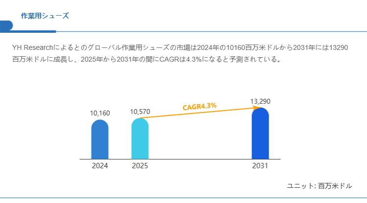 YH Researchの最新調査によると、世界の作業用シューズ市場は、2024年の10160百万米ドルから2025年には10570百万米ドルへと拡大し、2031年には13290百万米ドルに達すると予測されています。この間、CAGR(年平均成長率)は4.3%%と推計されています。