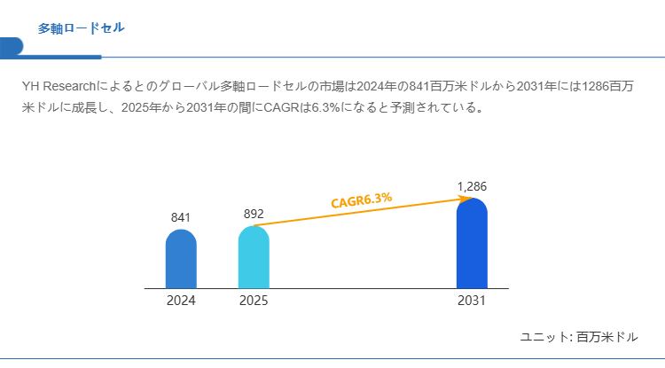 YH Researchによるとのグローバル多軸ロードセルの市場は2024年の841百万米ドルから2031年には1286百万米ドルに成長し、2025年から2031年の間にCAGRは6.3%になると予測されている。