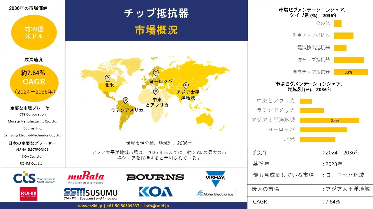 2023年、チップ抵抗器市場の売上高は約16億米ドルに達しました。さらに、当社の分析によると、チップ抵抗器市場は予測期間を通じて年平均成長率(CAGR)約7.64%で拡大し、2036年までに約39億米ドル規模に達すると見込まれています。