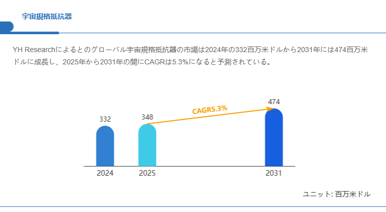 YH Researchによるとのグローバル宇宙規格抵抗器の市場は2024年の332百万米ドルから2031年には474百万米ドルに成長し、2025年から2031年の間にCAGRは5.3%になると予測されている。