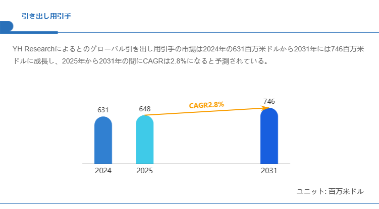 YH Researchによるとのグローバル引き出し用引手の市場は2024年の631百万米ドルから2031年には746百万米ドルに成長し、2025年から2031年の間にCAGRは2.8%になると予測されている。