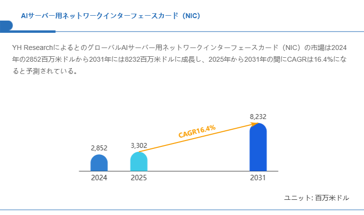 YH ResearchによるとのグローバルAIサーバー用ネットワークインターフェースカード(NIC)の市場は2024年の2852百万米ドルから2031年には8232百万米ドルに成長し、2025年から2031年の間にCAGRは16.4%になると予測されている。