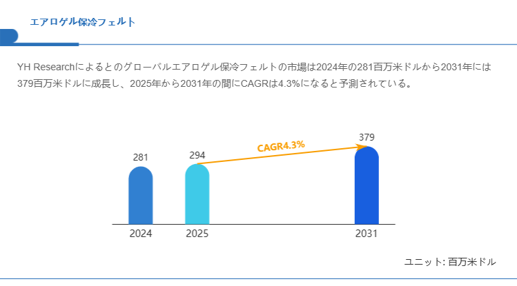 YH Researchによるとのグローバルエアロゲル保冷フェルトの市場は2024年の281百万米ドルから2031年には379百万米ドルに成長し、2025年から2031年の間にCAGRは4.3%になると予測されている。