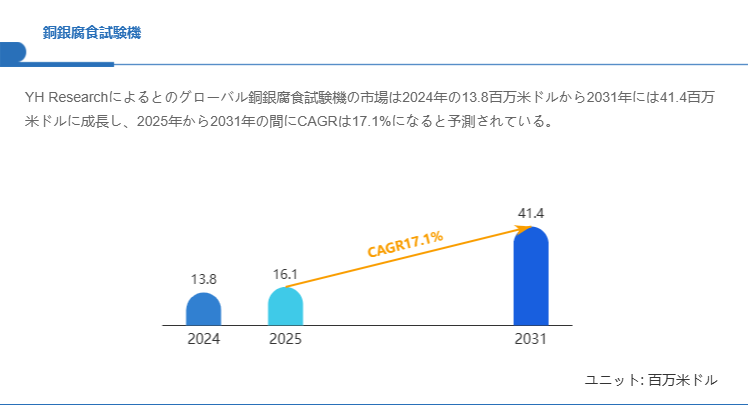 YH Researchによるとのグローバル銅銀腐食試験機の市場は2024年の13.8百万米ドルから2031年には41.4百万米ドルに成長し、2025年から2031年の間にCAGRは17.1%になると予測されている。